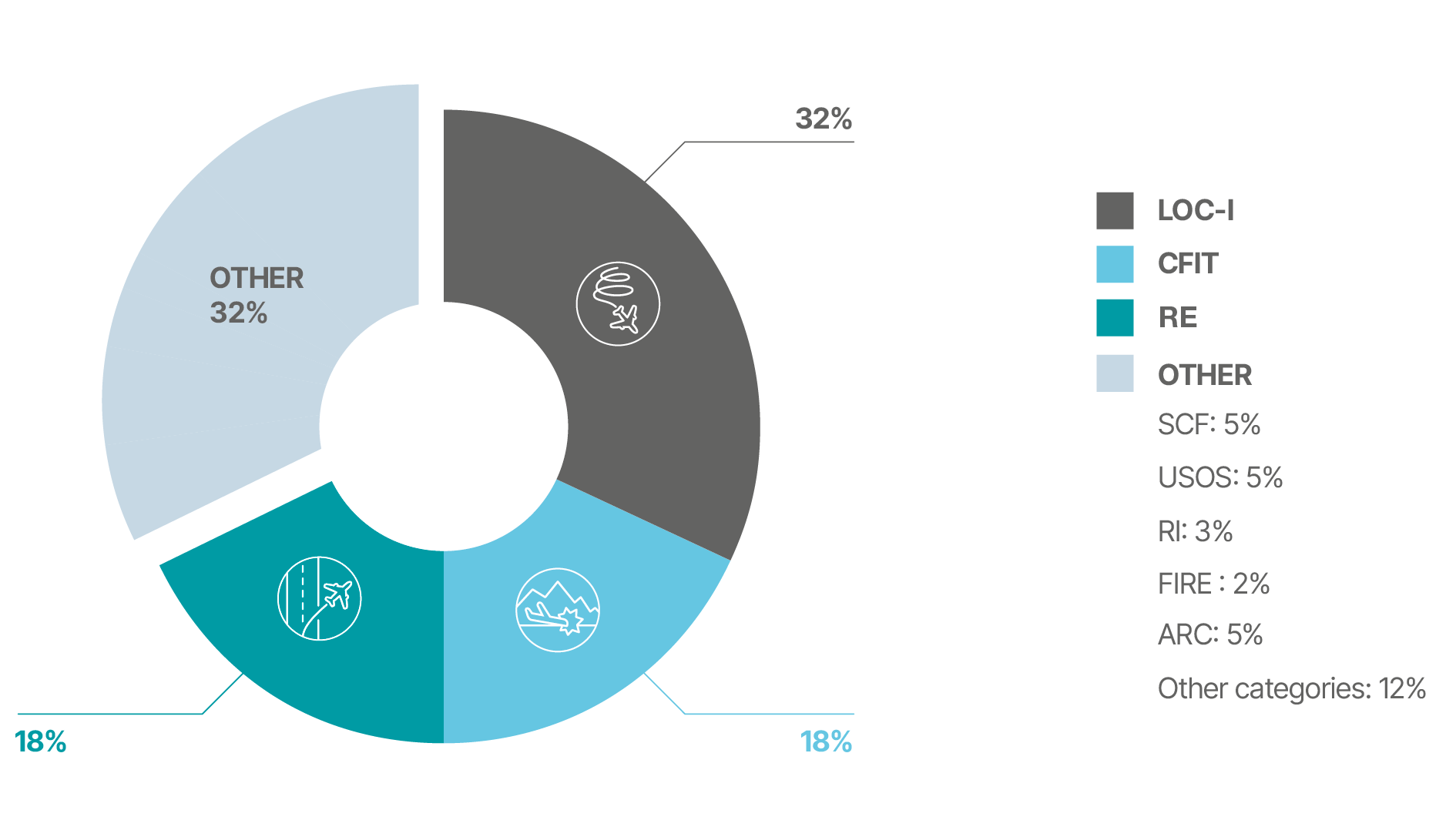 The accident categories described are based on standard ICAO definitions. The seven categories listed below are the accident types that are the cause of most accidents.