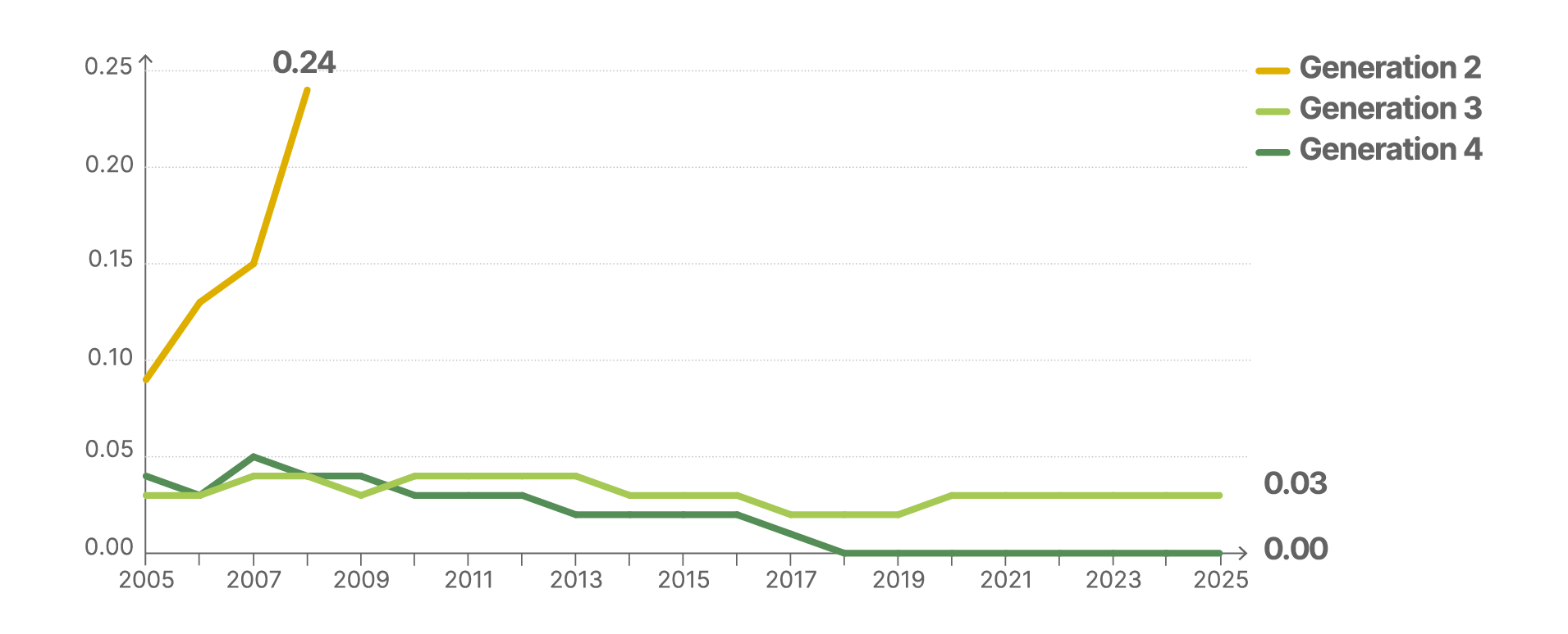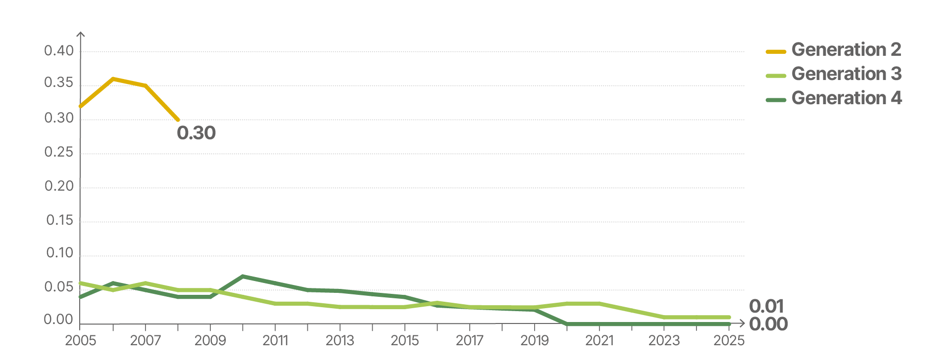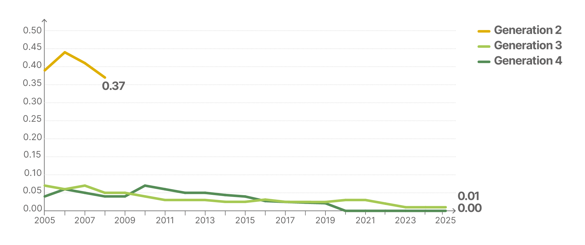 There were no fatal LOC-I accidents recorded for generation 4 aircraft in the last decade. Therefore, the 10-year moving average rate is zero for this generation in 2025. The rate of LOC-I hull loss accidents is 89% lower for generation 4 aircraft when compared with generation 3 aircraft.