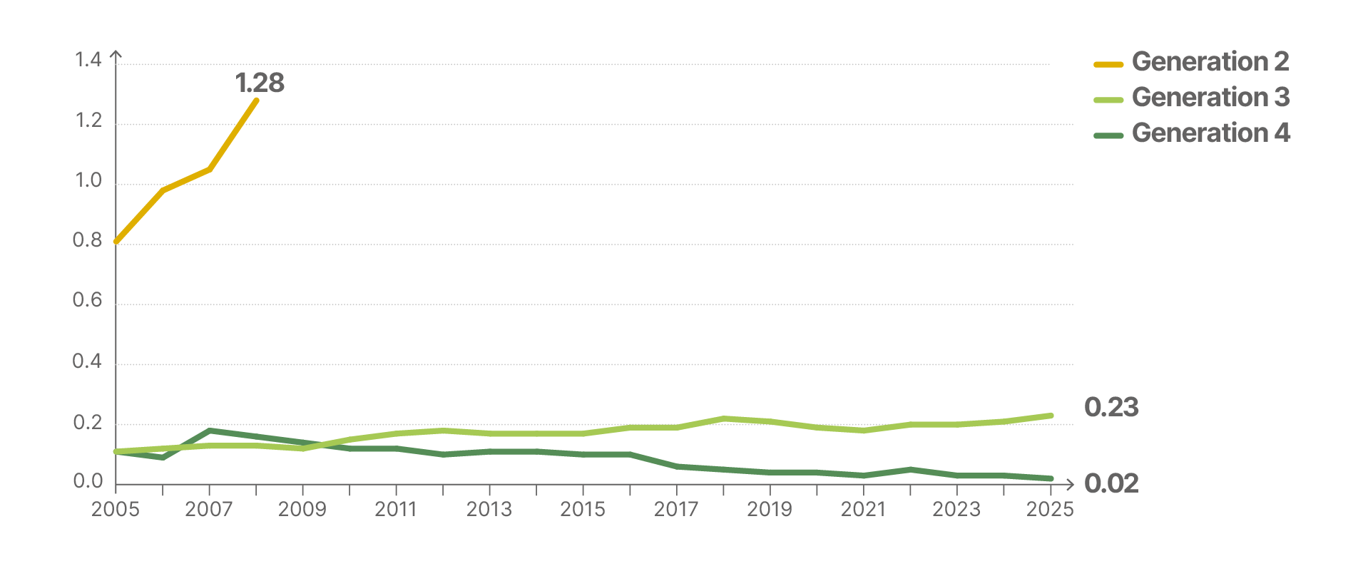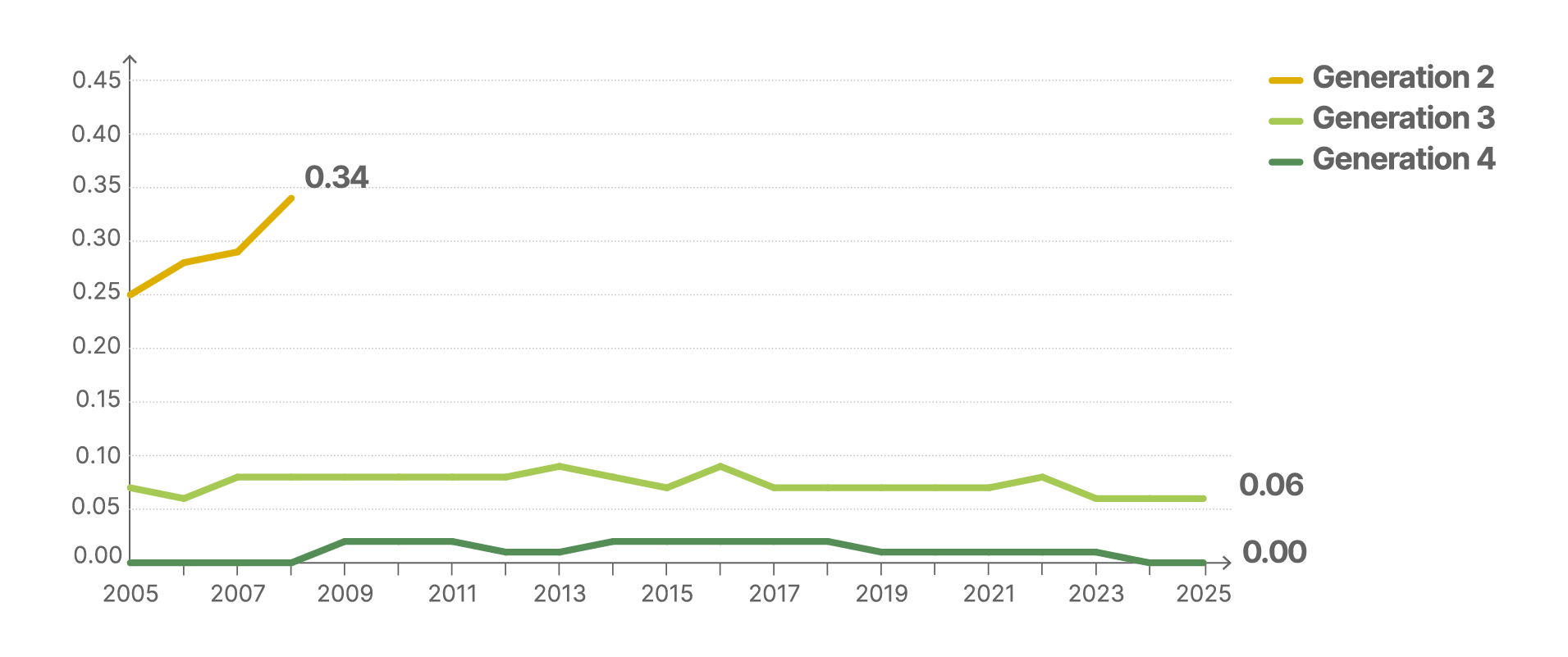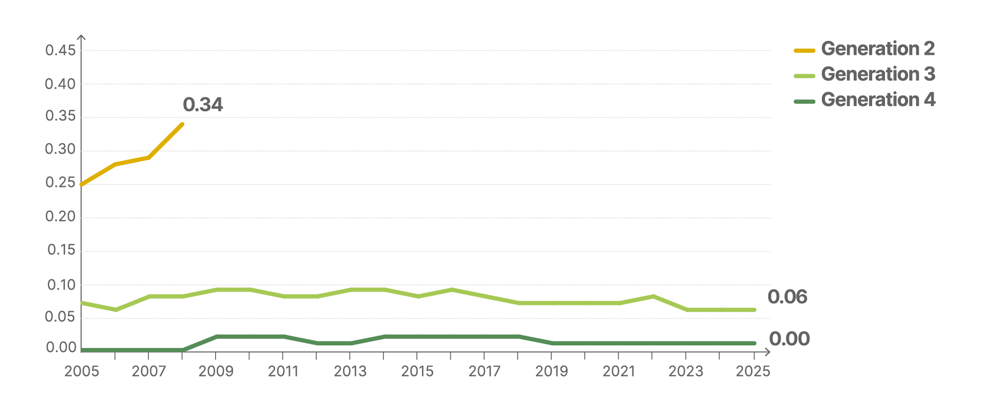 There were no fatal LOC-I accidents recorded for generation 4 aircraft in the last decade. Therefore, the 10-year moving average rate is zero for this generation in 2025. The rate of LOC-I hull loss accidents is 89% lower for generation 4 aircraft when compared with generation 3 aircraft.