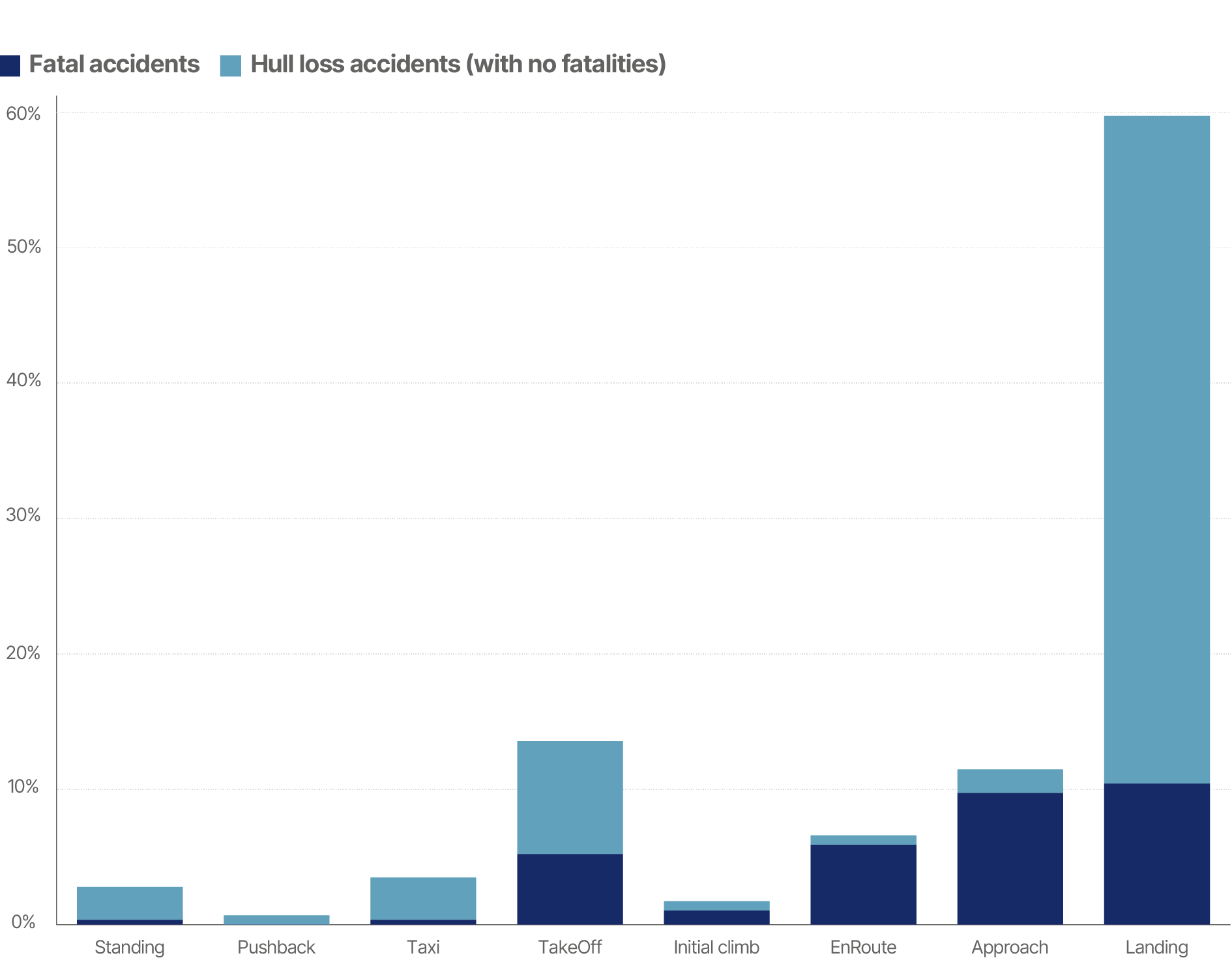 Of the 9 hull loss accidents without fatalities recorded in 2024, 7 occurred at landing and 2 occurred during take-off. A significant proportion of accidents recorded over the past two decades occurred during takeoff, approach, and landing phases.