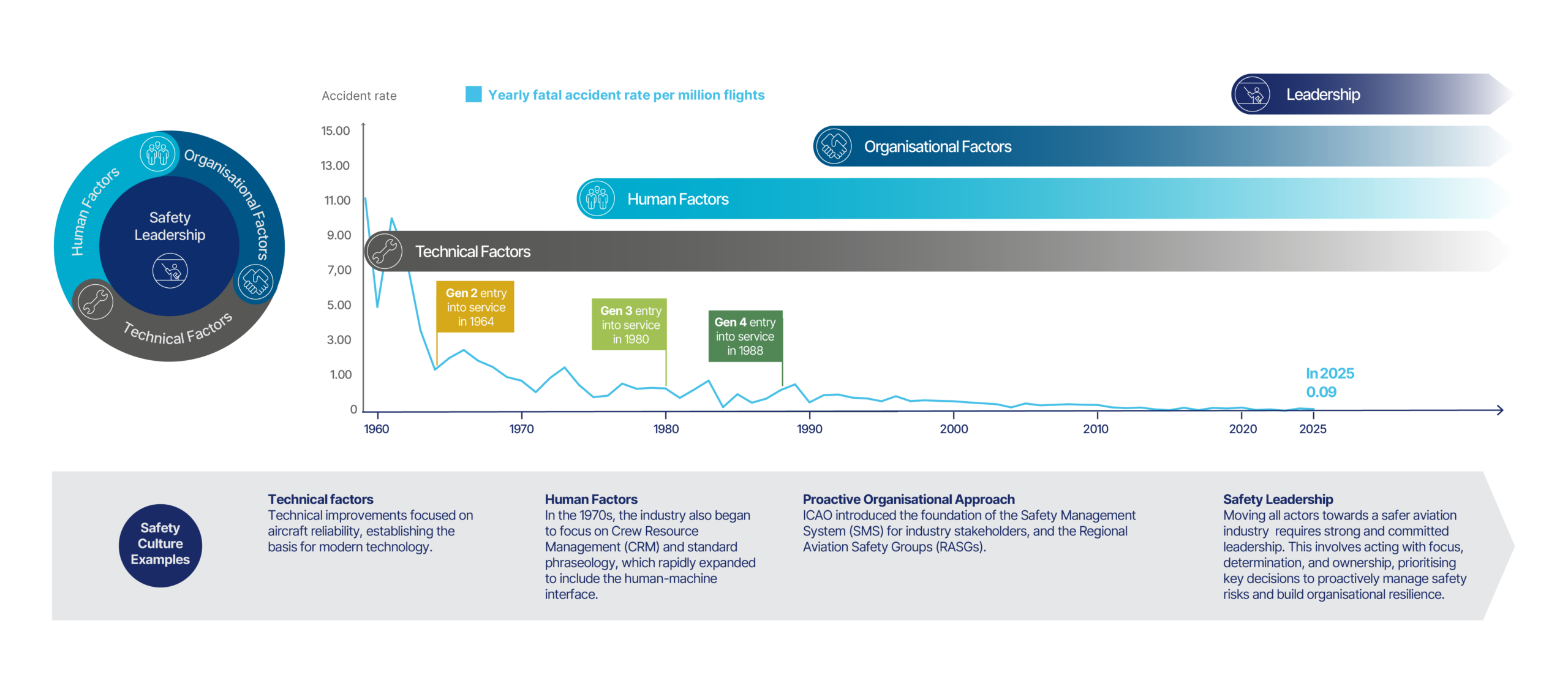 As illustrated in the infographic below, the aviation accident rate has continuously decreased. This is driven by technological advances of each aircraft generation and a positive safety culture which encompasses technical, human factors, and organisational factors.