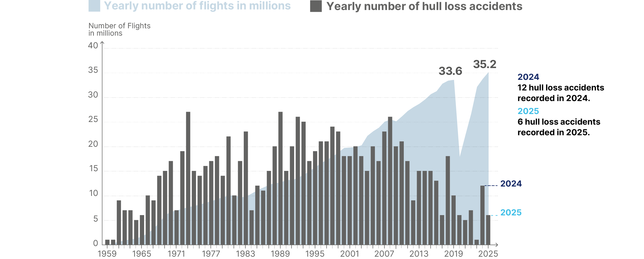 In contrast to 2024, which saw four fatal accidents and twelve hull losses, 2025 recorded three fatal accidents, all of which resulted in hull losses, alongside a further three hull losses without fatalities. The long term trend remains that the total number of accidents continues to decrease each decade.