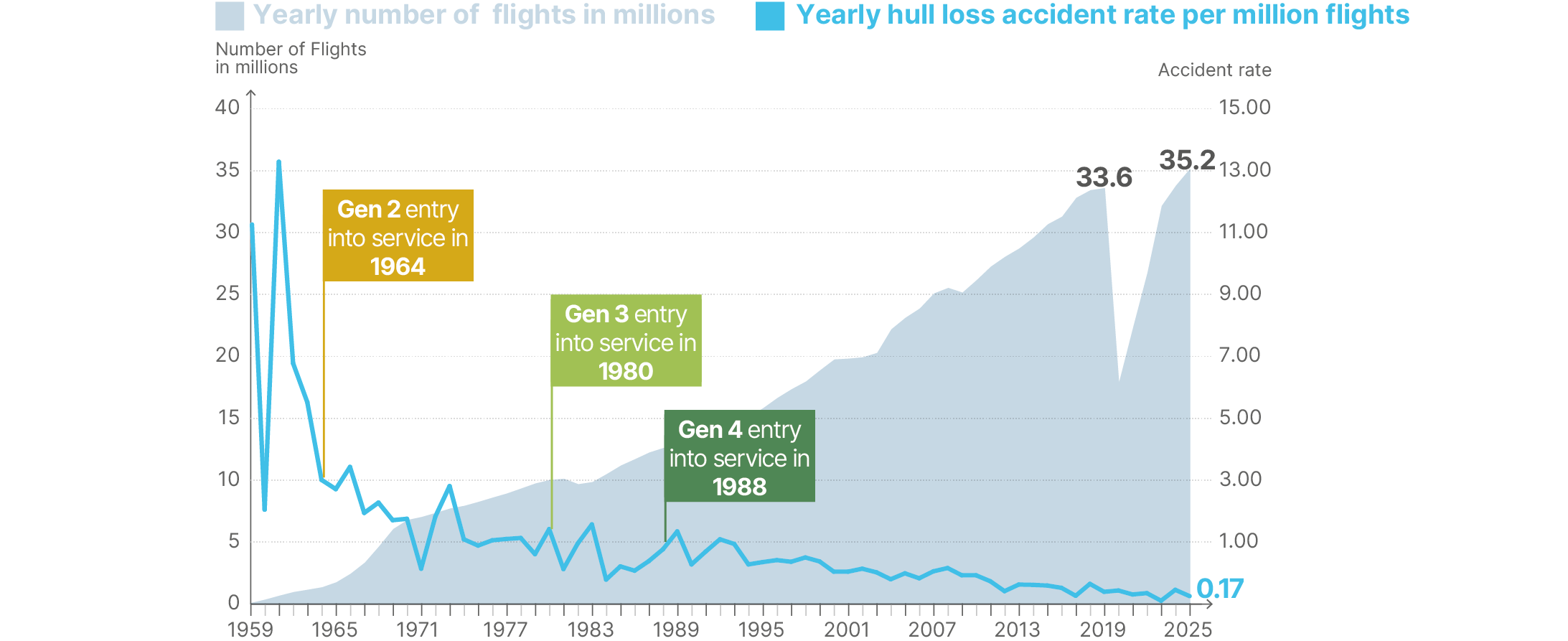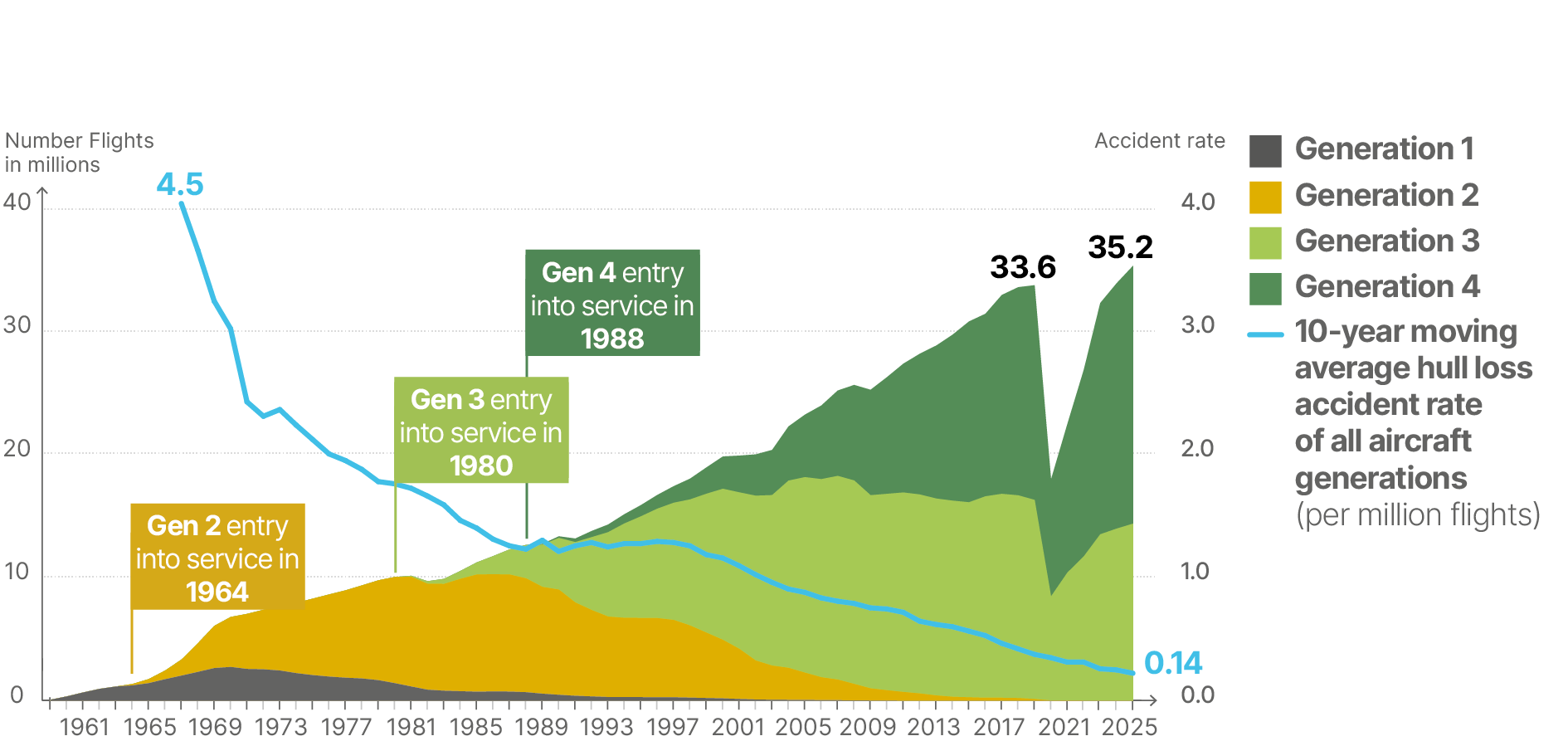 The 10-year moving hull loss average accident rate for all aircraft generations provides a clearer picture of an overall trend. A notable part of this success is due to effective regulation, a strong safety culture, and improvements in training. Technological advances are also a crucial enabler for enhancing the level of safety In particular, technologies introduced in aircraft systems intentionally evolved with improving safety as their aim. In 2025, all aircraft generations have a combined fatal accident rate of 0.14 hull losses per million flight cycles.