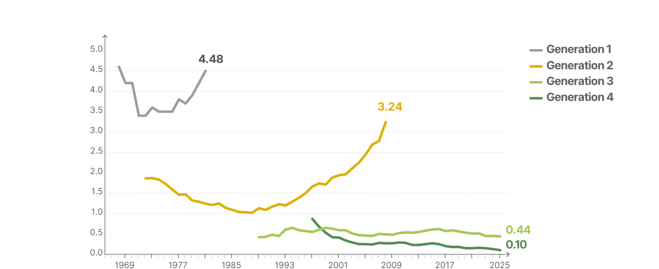 A comparison of hull loss accident rates by generation of aircraft provides a clear illustration of the value of commercial aviation industry investments in technology to improve safety. generation 4 aircraft have the lowest hull loss rate of all. In 2025, generation 4 aircraft had a rate of 0.10 hull losses per million flight cycles. This rate is more than 3 times lower than the previous generation 3 jets.