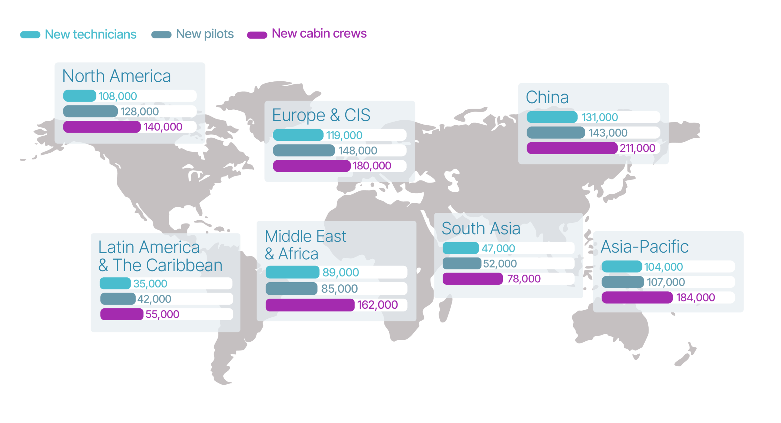 The industry anticipates recruiting 2.35 million skilled professionals to manage this growth. The graph below shows a projection of the global workforce required for the next 20 years with a forecast by region.
